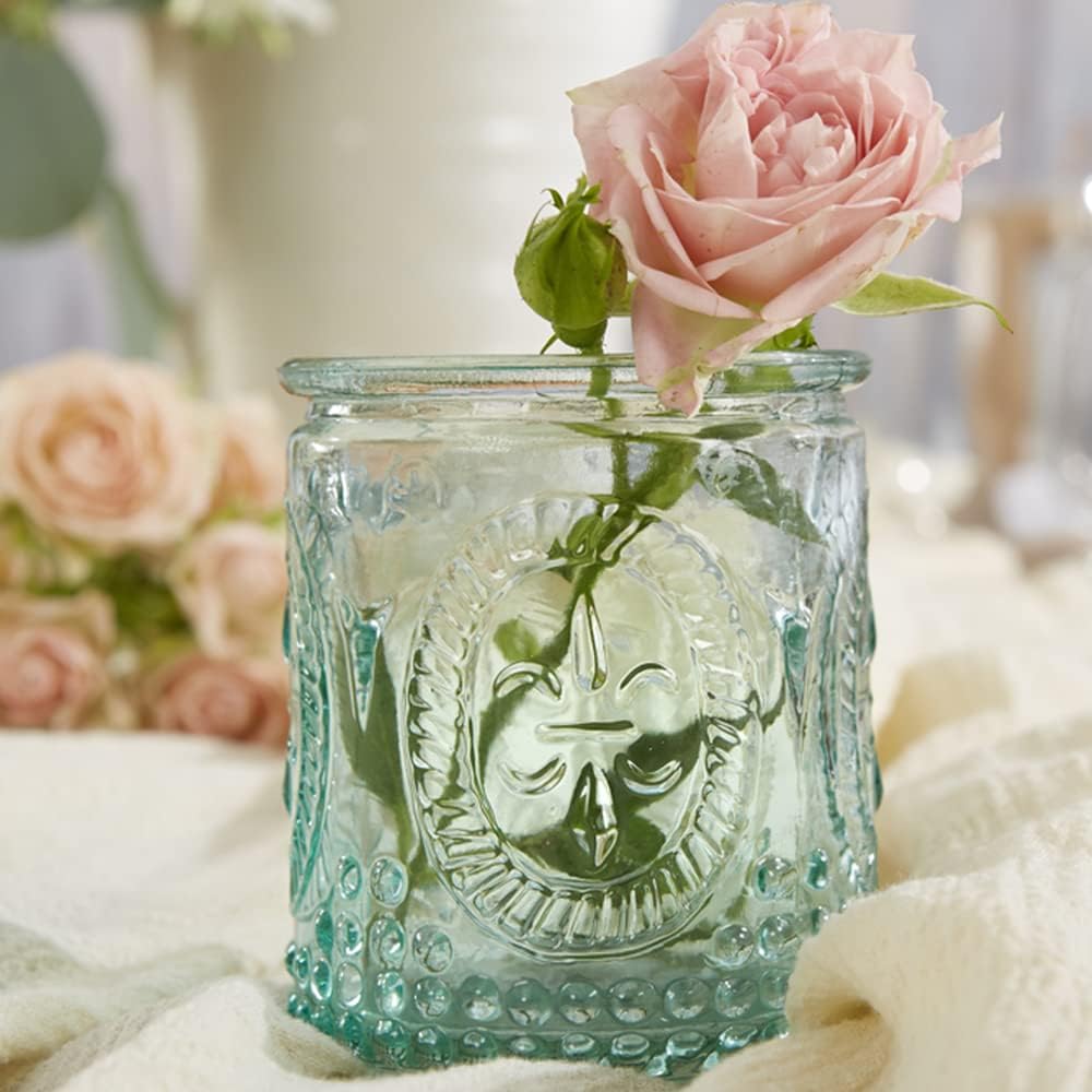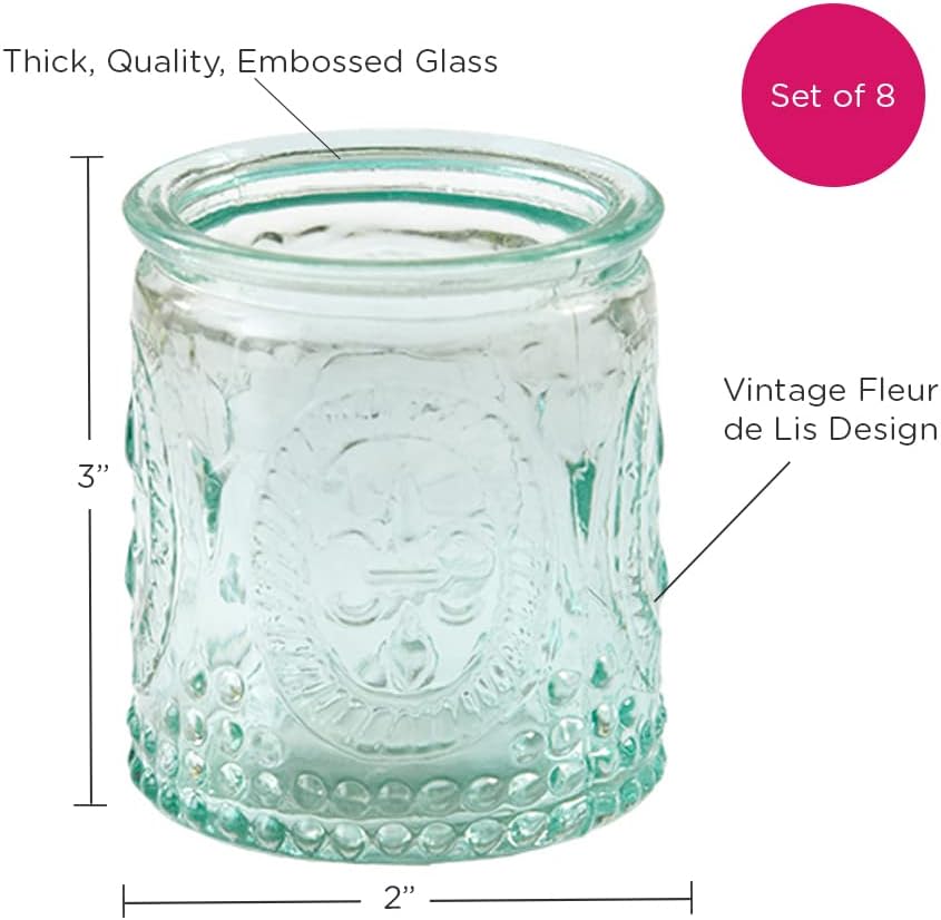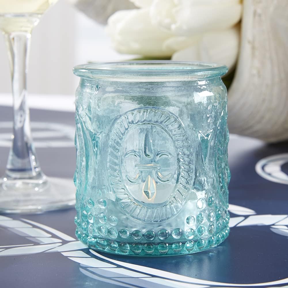 - BEAUTIFUL & FUNCTIONAL The Blue Glass Votive Candle Holder features a fleur de lis design around the outside of the glass and is sold in a set of 8 and wrapped securely in bubble wrap and shipped in a white box. This vintage glass candle holder from Kate Aspen comes in a set of four to serve as a centerpiece and also makes a great favor container for your guests. Enhance your home decor with a classic decoration that can be filled with anything from candies to small gifts.